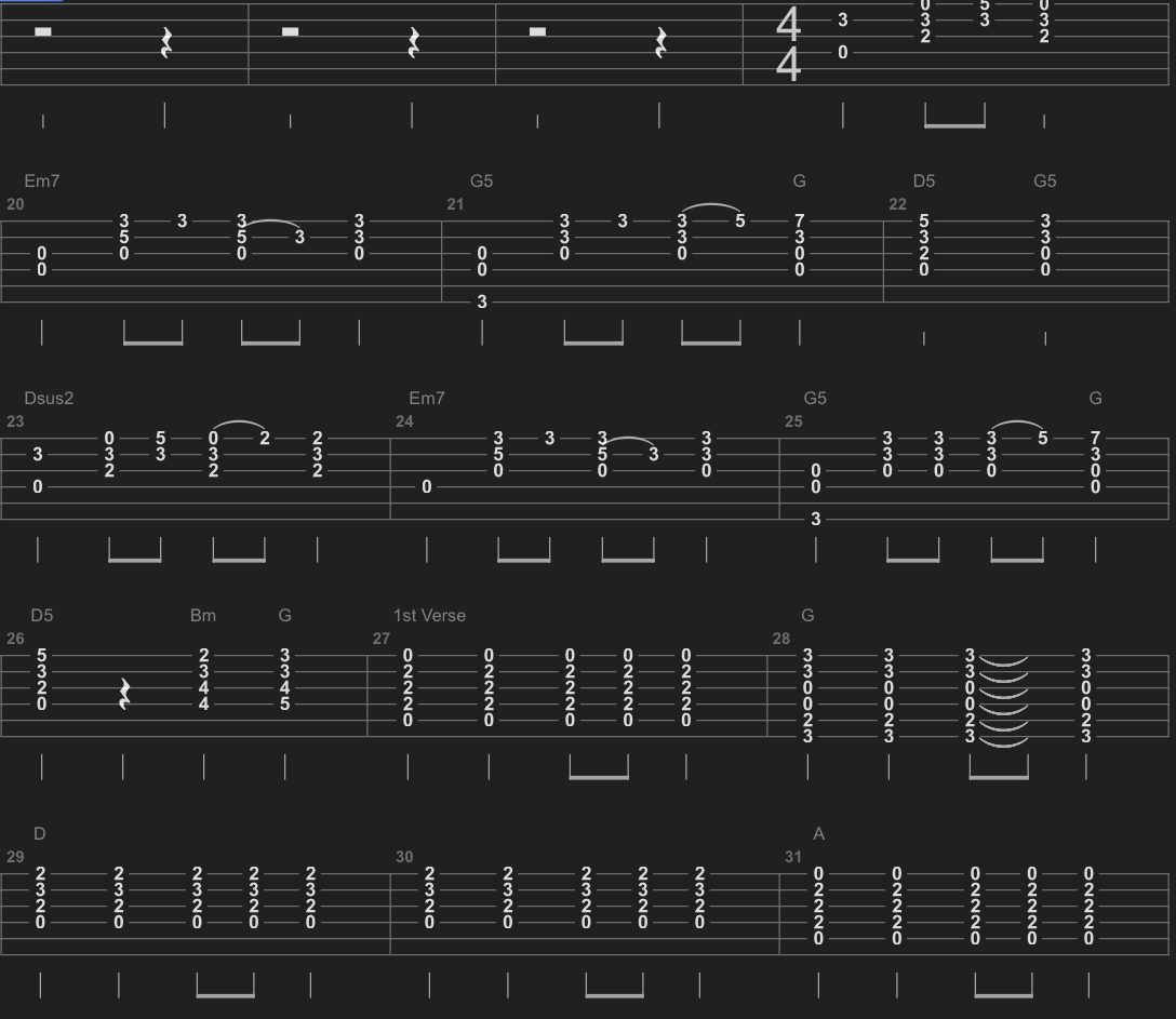 Here is a tab I just found online — This is just a few bars of the song… you can see it’s packed with tiny details.